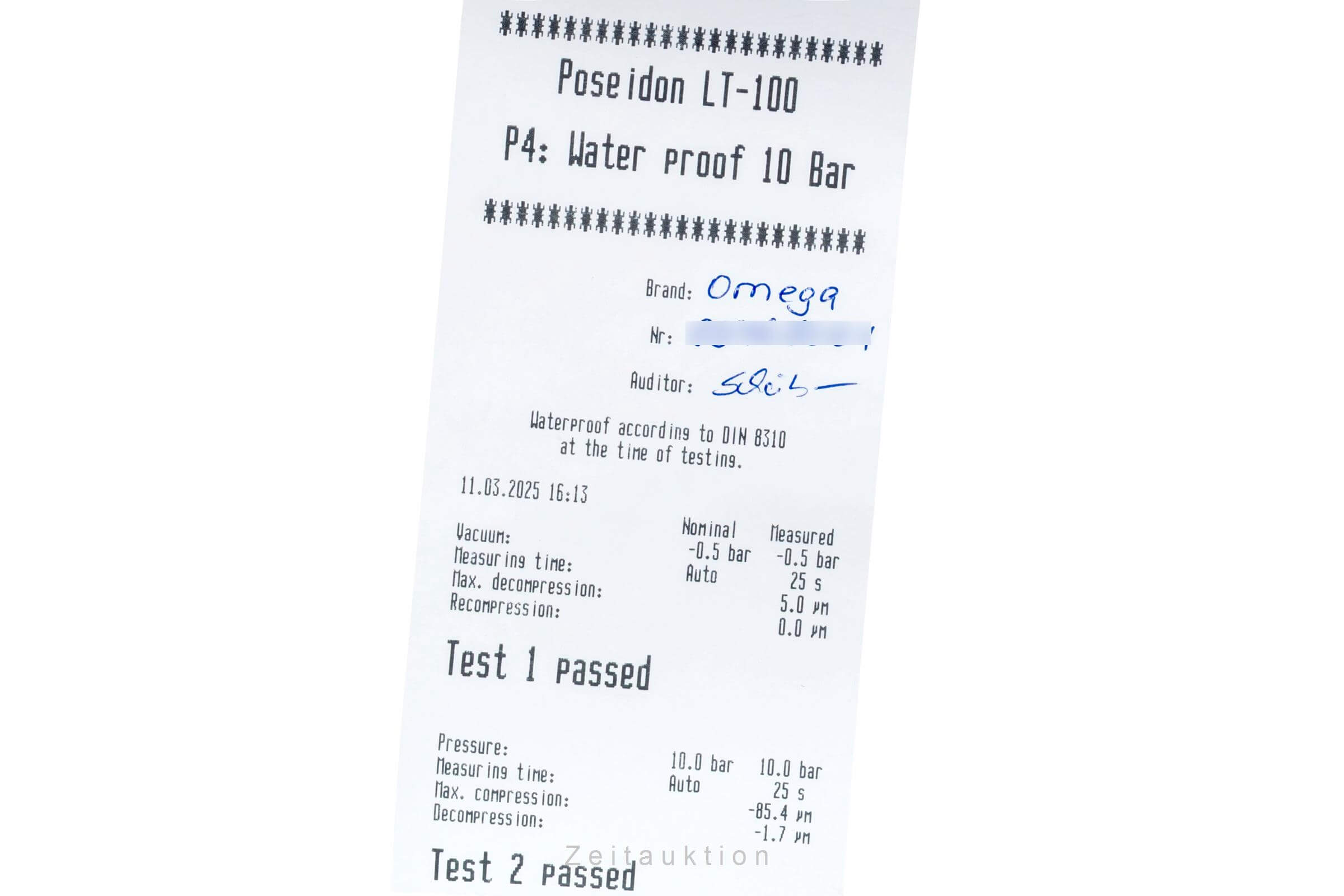 Wenn die Uhr positiv auf Wasserdichtigkeit getestet wurde, dann beziehen sich die Wasserdichtheitsangaben auf den Zeitpunkt und den Prüfdruck, der auf dem beiliegenden Protokoll steht. Wasserdichtigkeit ist nach DIN 8310 keine bleibende Eigenschaft, da vorhandene Dichtungen der natürlichen Alterung und dem Verschleiß unterliegen. Bitte beachten Sie die beiliegenden Hinweise zur Wasserdichtigkeit und das Prüfprotokoll, welches der Uhr beiliegt. Wenn keine Angaben zur Wasserdichtigkeit vorliegen, dann wurde die Uhr von uns nicht getestet.