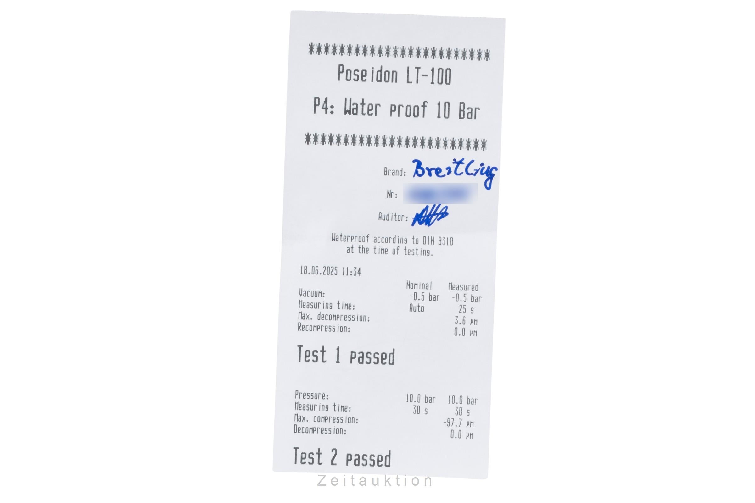 Wenn die Uhr positiv auf Wasserdichtigkeit getestet wurde, dann beziehen sich die Wasserdichtheitsangaben auf den Zeitpunkt und den Prüfdruck, der auf dem beiliegenden Protokoll steht. Wasserdichtigkeit ist nach DIN 8310 keine bleibende Eigenschaft, da vorhandene Dichtungen der natürlichen Alterung und dem Verschleiß unterliegen. Bitte beachten Sie die beiliegenden Hinweise zur Wasserdichtigkeit und das Prüfprotokoll, welches der Uhr beiliegt. Wenn keine Angaben zur Wasserdichtigkeit vorliegen, dann wurde die Uhr von uns nicht getestet.