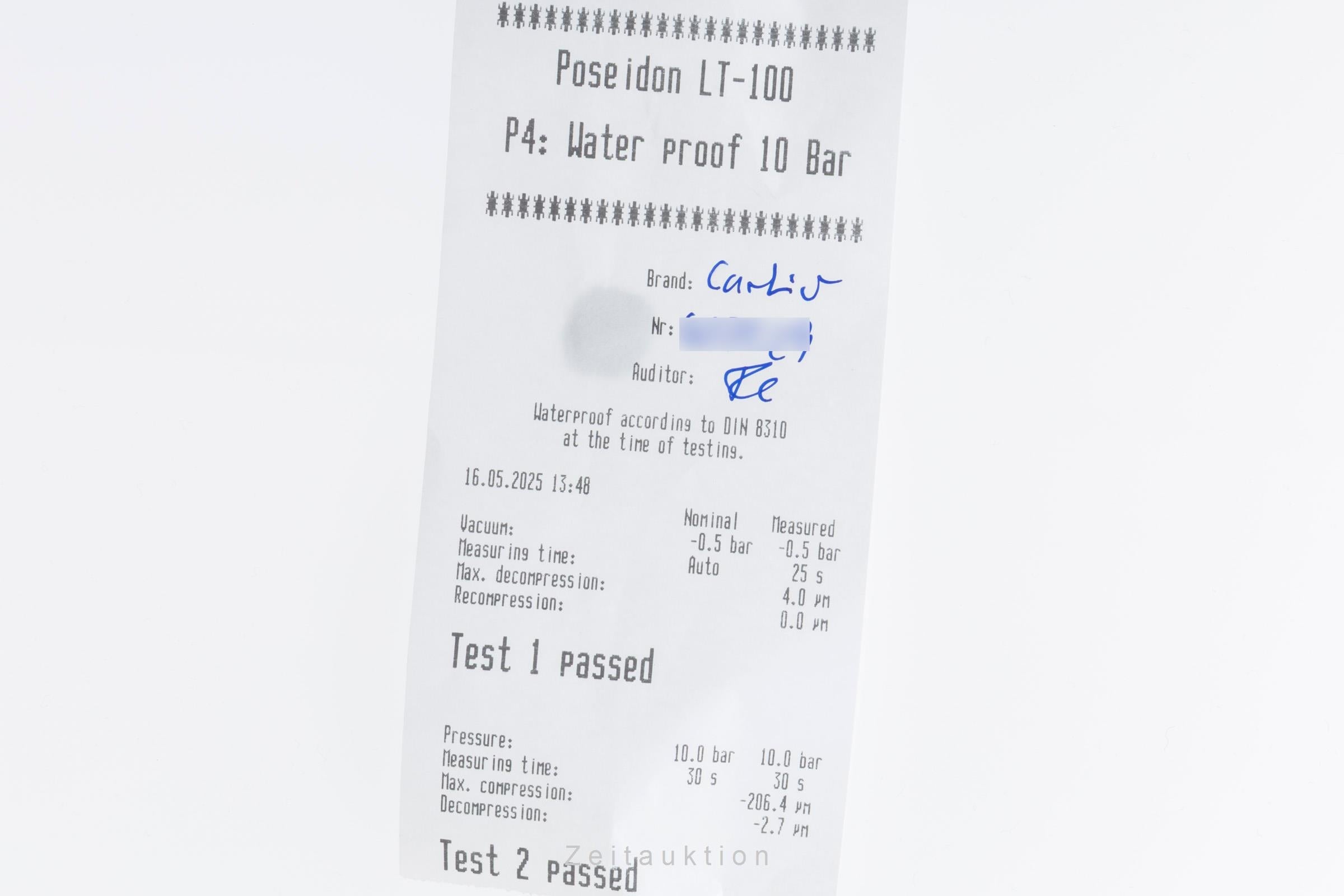 If the watch has been tested for water resistance, detailed infomation about the time and pressure used in the test can be found on the enclosed protocol. According to DIN 8310, a watch's water resistance is not permanently guaranteed. It is affected by the aging of gaskets or deformation of watch parts over the course of time. Please refer to the enclosed information about water resistance and have a look at the test certificate. In case there is no infomation on any specified water resistance level, the watch has not been tested by us.